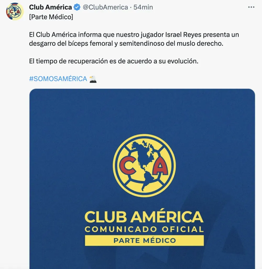 Las Águilas del América comunicaron este martes el reporte médico de Israel Reyes, quien salió lesionado del terreno de juego, durante el partido ante Cruz Azul del pasado fin de semana.