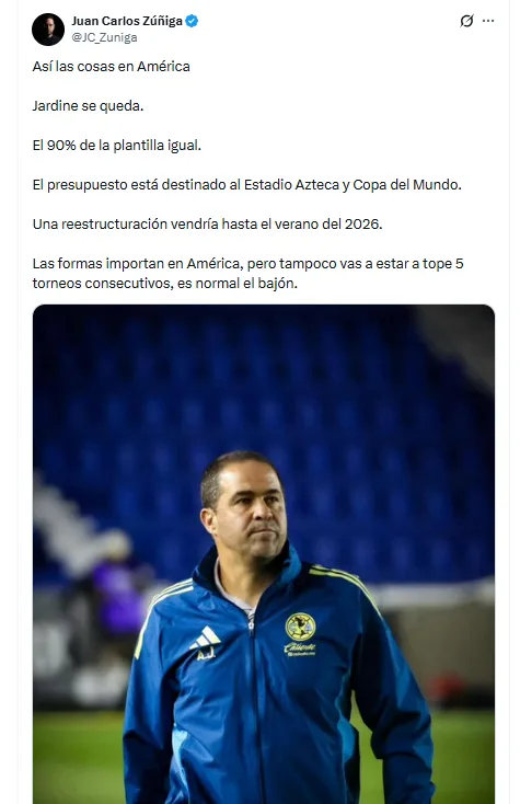 A pesar de que las Águilas del América cayeron dolorosamente, de último minuto y con un hombre más ante Rayados de Monterrey en la Vuelta de los Cuartos de Final del Apertura 2025. La directiva americanista NO HARÁ CAMBIOS para el Clausura 2026 y tanto André Jardine como la mayoría de la plantilla seguirá en el equipo para el próximo torneo.