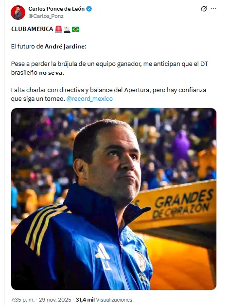 Mientras que en el caso de si André Jardine se quedará en el banquillo del América, la después es SÍ. Según diversos comunicadores, no habrá cambios en la dirección técnica. Ya que la directiva de los azulcremas tiene previsto hacer modificaciones para el torneo del Apertura 2026.