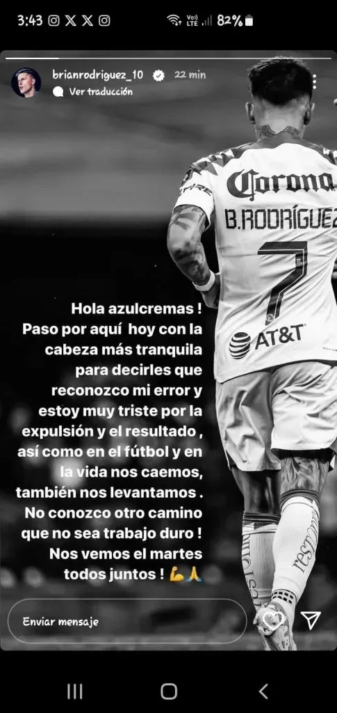 Fue un día después y por medio de sus redes sociales cuando Brian publicó un mensaje reconociendo su error que lo llevó a ser expulsado y dejar al América con 10 hombres, en lo que fue la recta final del partido. Donde los americanistas cayeron por un marcador de 2-1 ante los felinos.