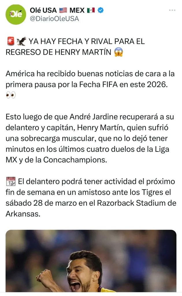 Henry Martín ya tiene fecha de regreso al equipo puesto que un reporte del medio Olé reveló que el futbolista ya está listo para regresar el próximo sábado 28 de marzo.