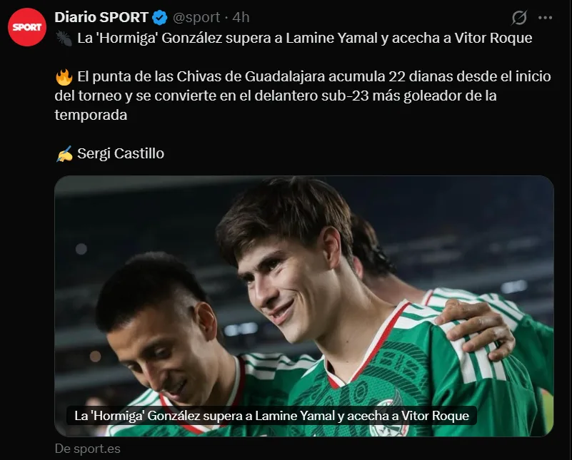 “Semejante explosión goleadora ha activado las alertas en los despachos de la Ciudad Deportiva Joan Gamper. El Barça, siempre buscando adelantarse en el mercado para captar talento joven con proyección, tiene excelentes informes del delantero de Chivas.”, expone el diario Sport en una de sus columnas.