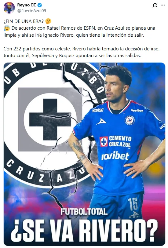 “De acuerdo con Rafael Ramos de ESPN, en Cruz Azul se planea una limpia y ahí se iría Ignacio Rivero, quien tiene la intención de salir. Con 232 partidos como celeste, Rivero habría tomado la decisión de irse. Junto con él, Sepúlveda y Bogusz apuntan a ser las otras salidas”.