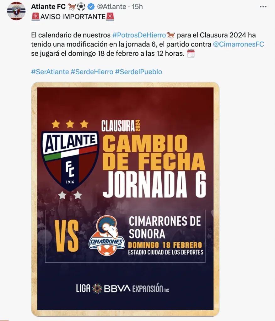 “Aviso importante. El calendario de nuestros Potros de Hierro para el Clausura 2024 ha tenido una modificación en la jornada 6, el partido contra Cimarrones se jugará el domingo 18 de febrero a las 12 horas”