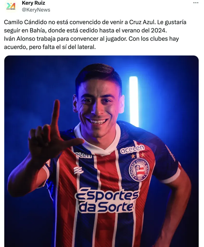 “Camilo Cándido no está convencido de venir a Cruz Azul. Le gustaría seguir en Bahía, donde está cedido hasta el verano del 2024. Iván Alonso trabaja para convencer al jugador. Con los clubes hay acuerdo, pero falta el sí del lateral”
