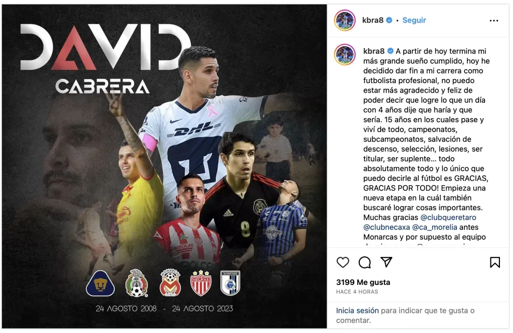 “Muchas gracias Querétaro, Necaxa, Morelia y por supuesto al equipo de mis amores: Pumas, sin ustedes todos estos 15 años no hubieran sido posibles, nos vemos pronto estoy seguro”.