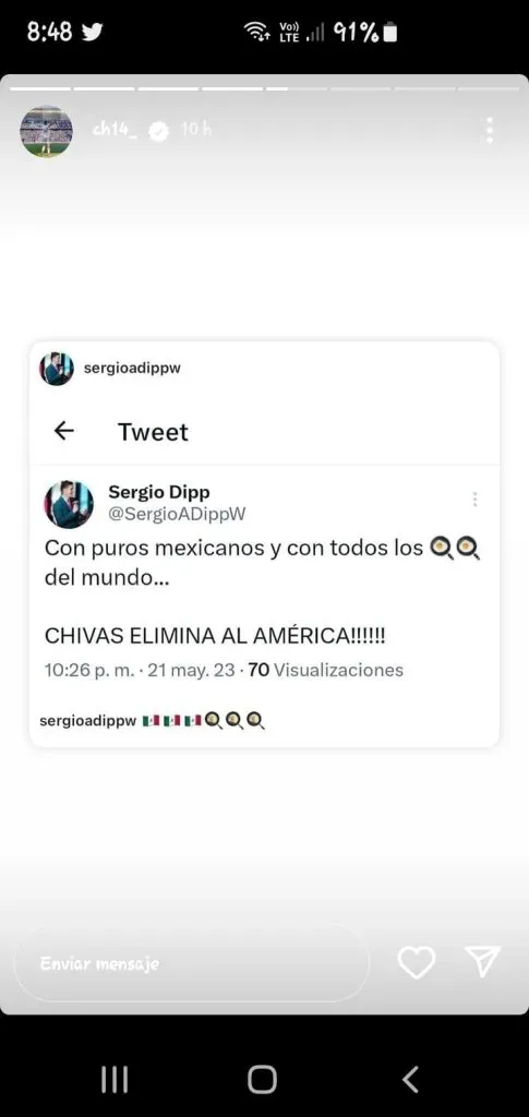 No fue lo único que compartió el jugador del LA Galaxy, pues también aprovechó para mostrar un mensaje de su amigo, Sergio Dipp, el cual dice: “Con puros mexicanos y con todos los hue… del mundo. Chivas elimina al América”.