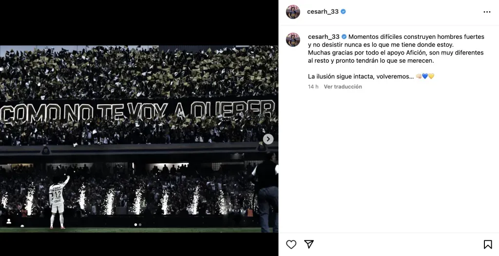 “Momentos difíciles construyen hombres fuertes y no desistir nunca es lo que me tiene donde estoy. Muchas gracias por todo el apoyo Afición, son muy diferentes al resto y pronto tendrán lo que se merecen. La ilusión sigue intacta, volveremos…”