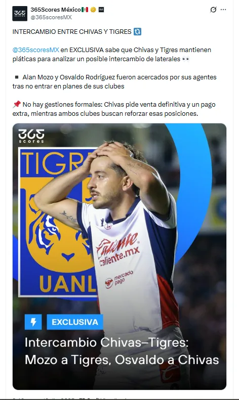 Con información de los amigos de 365scores se dio a conocer que Chivas y Tigres se encontrarían en plenas pláticas para conseguir un intercambio de dos de sus joyas. Y quienes entrarían en la ecuación serían los laterales Alan Mozo del Rebaño Sagrado y Osvaldo Rodríguez de Tigres.