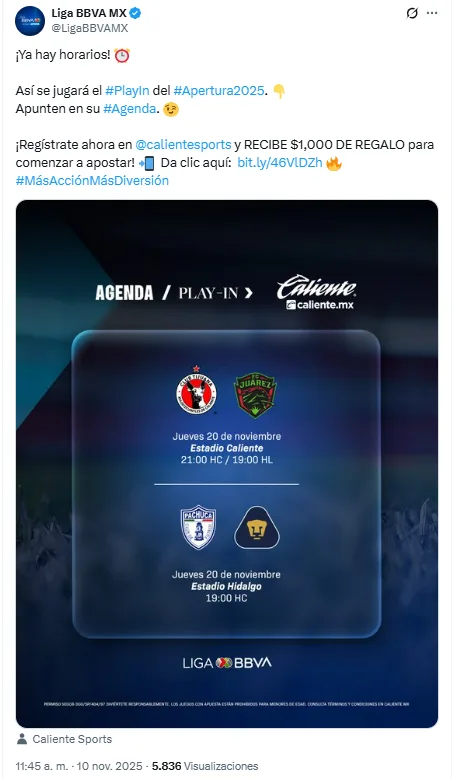 La espera terminó y ya conocemos los horarios del Play-In, donde el jueves 20 de noviembre los encargados de inaugurar la jornada serán los Pumas de la UNAM en su visita a los Tuzos de Pachuca en el estadio Hidalgo. Y para cerrar la jornada, Xolos de Tijuana recibirán a los Bravos de Juárez.