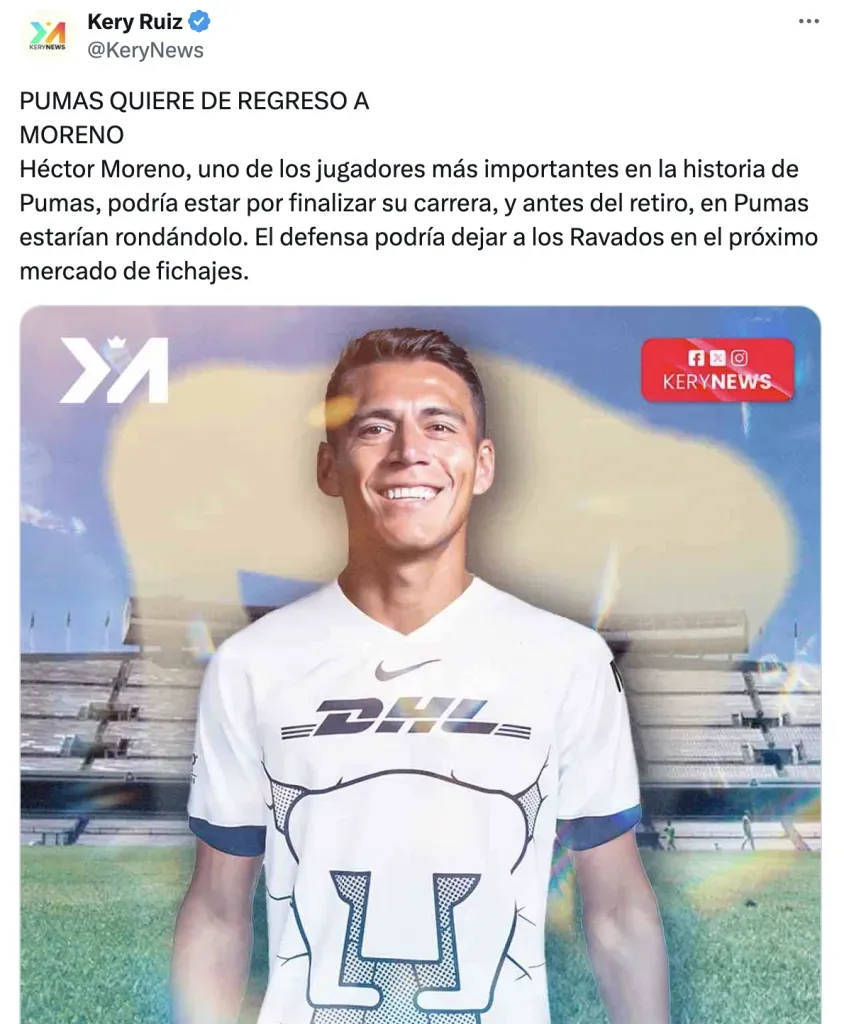 “Lo quieren de regreso. Héctor Moreno, uno de los jugadores más importantes en la historia de Pumas, podría estar por finalizar su carrera, y antes del retiro, en Pumas estarían rondándolo. El defensa podría dejar a los Rayados en el próximo mercado de fichajes”