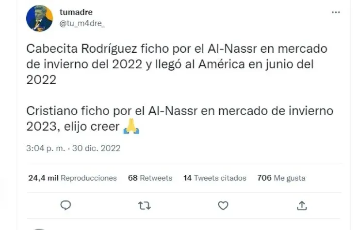 “La carrera de Ronaldo en el máximo nivel llegó a su fin. Esperemos siga los pasos de mi cabecita Rodríguez en el Al – Nassr”; “El Club América ya sabe lo que es hacer negocios con Al Nassr”, fueron solo algunos de los comentarios.