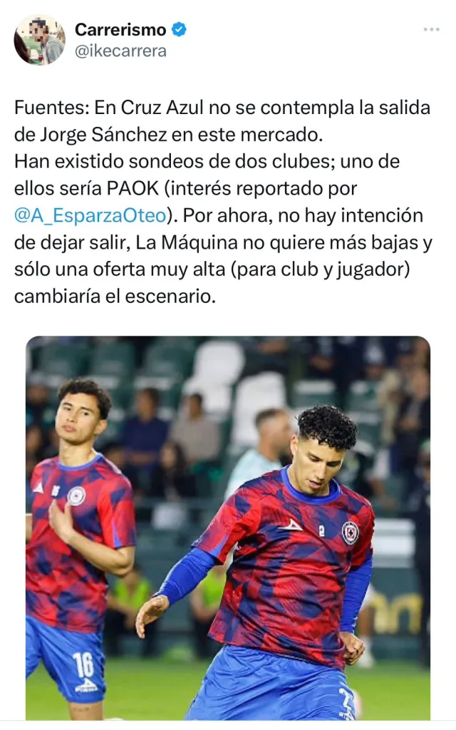 Según Ike Carrera, aunque la directiva Cementera habría dicho no al supuesto interés del PAOK de Grecia, sí hay algo que podría cambiar su decisión. Y es que la Máquina únicamente analizaría la posibilidad de dejar ir a Jorge Sánchez si existe una oferta económicamente muy alta.