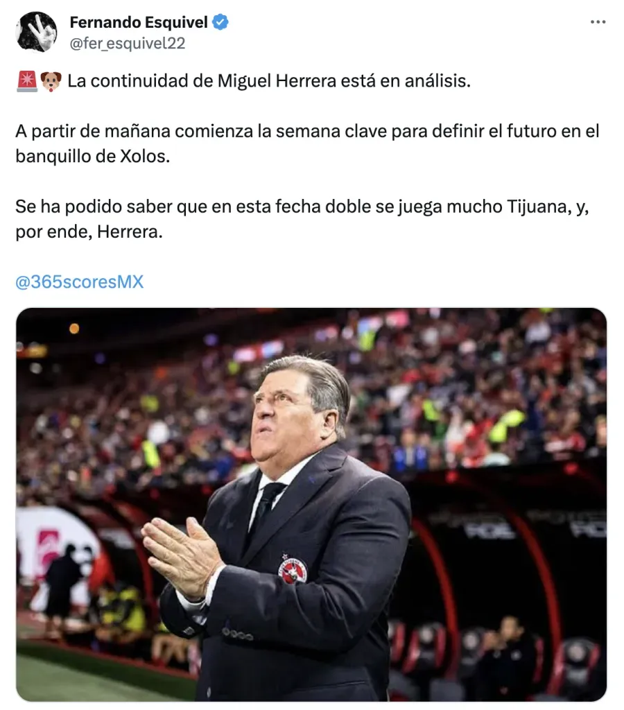 De acuerdo con la información de Fernando Esquivel, la directiva de Tijuana pondría bajo análisis a Miguel Herrera en esta fecha doble, comenzando por el partido más importante que sostendrán: ante Cruz Azul.