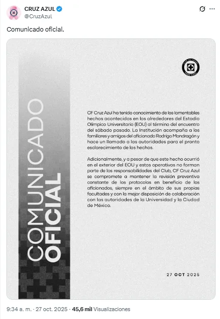 “Adicionalmente, y a pesar de que este hecho ocurrió en el exterior del EOU y estos operativos no forman parte de las responsabilidades del club, Cruz Azul se compromete a mantener la revisión preventiva constante de los protocolos en beneficio de los aficionados, siempre en el ámbito de sus propias facultades y con la mejor disposición de colaboración con las autoridades de la Universidad y la Ciudad de México”.