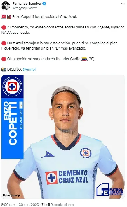 “Enzo Copetti fue ofrecido al Cruz Azul. Al momento, YA exiten contactos entre Clubes y con Agente/Jugador. NADA avanzado. Cruz Azul trabaja a la par está opción, pues si se complica el plan Figueiredo, ya tendrían un plan “B” más avanzado. Otra opción ya sondeada es Jhonder Cádiz (28)”
