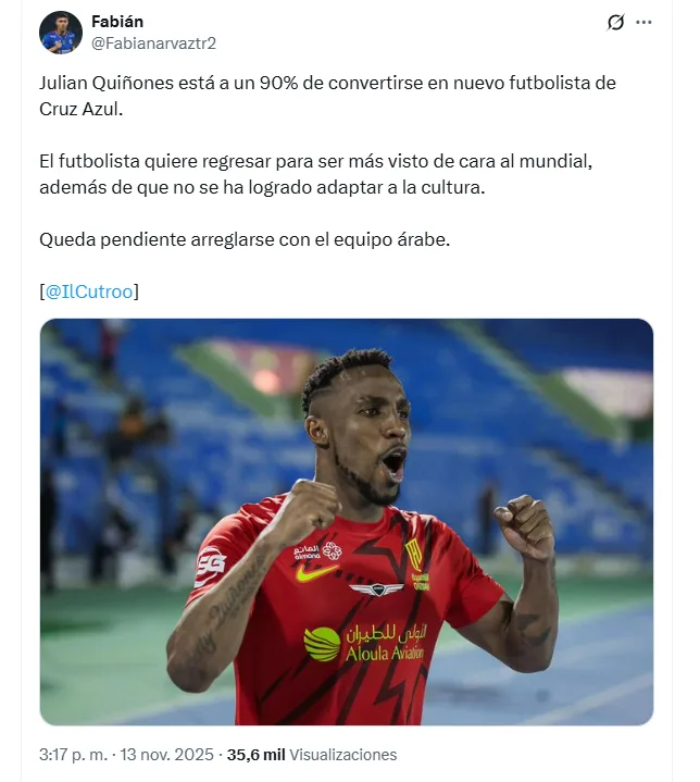 Por eso es por lo que pudimos enterarnos de que los directivos de Cruz Azul solo habrían sondeado el entorno de Julián Quiñones para saber cómo se encuentra en el Al-Qadisiya. Pues tendrían entre manos hacer una propuesta al conjunto de la Liga Árabe para que accedan a un préstamo.