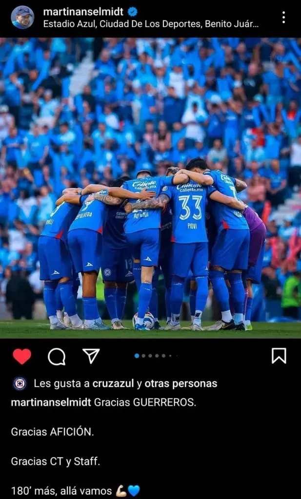 Anselmi compartió una serie de imágenes del encuentro y del vestidor cementero donde se le ve más que comprometido tanto a él como al resto del equipo con su proyecto. Por ello aprovechó para lanzarles un reto al resto del club de cara a la gran final al publicar esto como post, pues todavía queda mucho camino por recorrer rumbo al título.