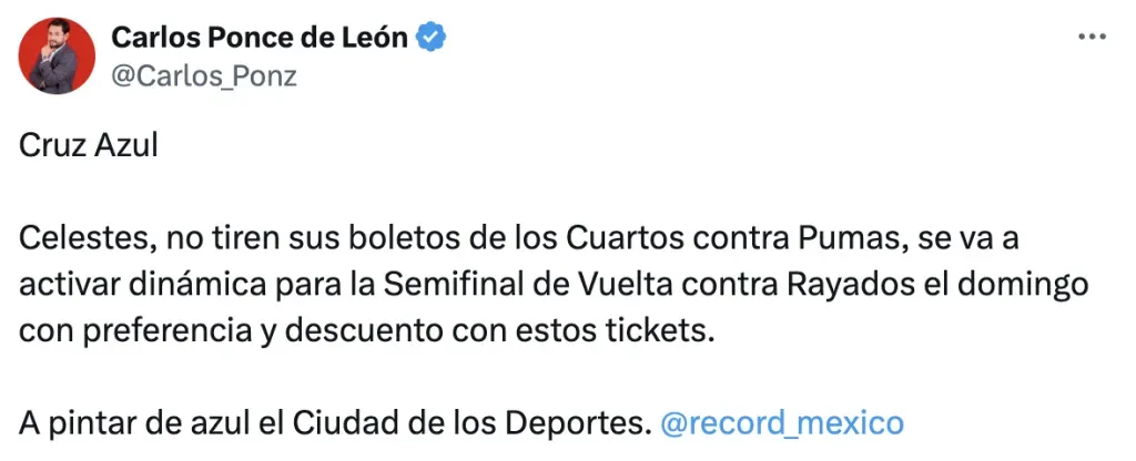 “Celestes, no tiren sus boletos de los Cuartos contra Pumas, se va a activar dinámica para la Semifinal de Vuelta contra Rayados el domingo con preferencia y descuento con estos tickets”