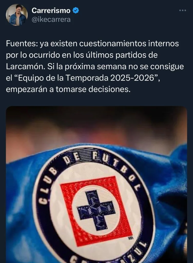 De acuerdo con la información del periodista Ike Carrera, ya existen cuestionamientos internos en Cruz Azul por los últimos resultados del equipo. Por ello, si a partir de la próxima semana no se consigue él “equipo de la temporada 2025-2026”, se tomarán decisiones.
