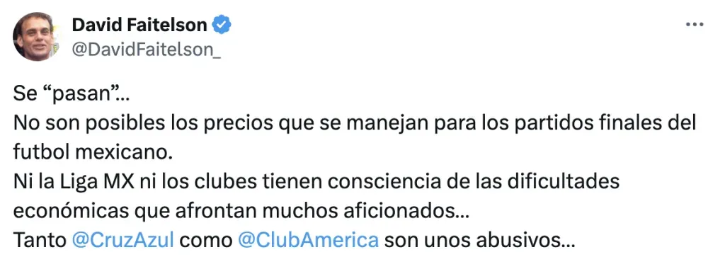“Se ‘pasan’… No son posibles los precios que se manejan para los partidos finales del futbol mexicano. Ni la Liga MX ni los clubes tienen consciencia de las dificultades económicas que afrontan muchos aficionados… Tanto Cruz Azul como Club América son unos abusivos…”