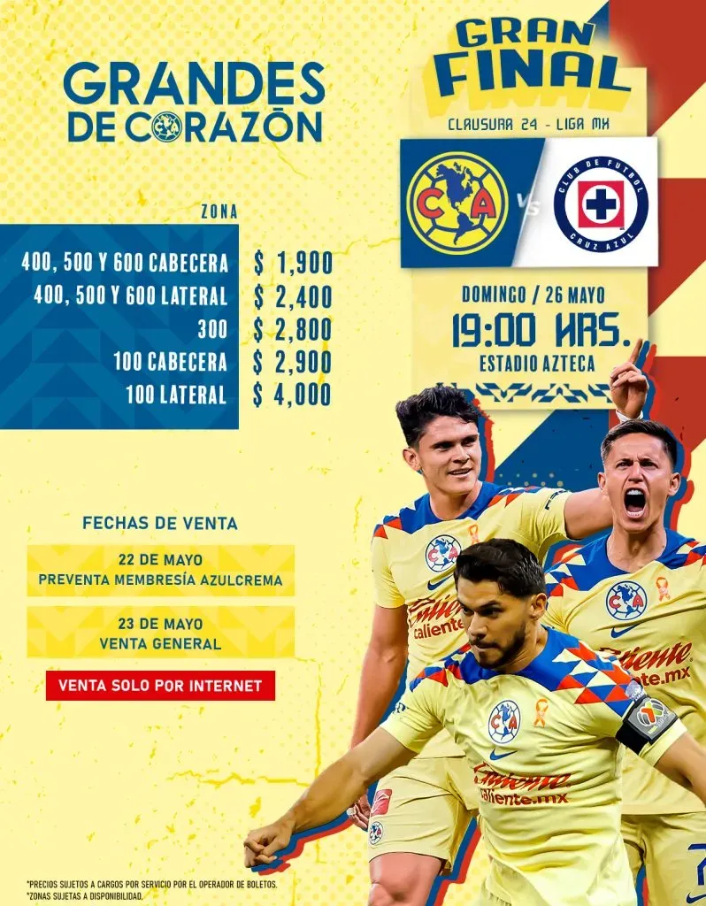 Para la final de ida, la Máquina oficializó los precios, que el más económico es de mil pesos, mientras que el más caro es de 4 mil, más los cargos extras que te genera Ticketmaster, mientras que para la final de vuelta, el boleto más económico es de mil 900 pesos, mientras que el más caro de 4 mil; de igual manera, sin incluir cargos extra.