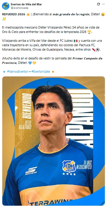 Estamos hablando de Dieter Villalpando, medio centro ofensivo de 34 años quien hoy fue confirmado como nuevo fichaje por el Everton de Viña del Mar para disputar el torneo de la Liga de Primera de Chile.