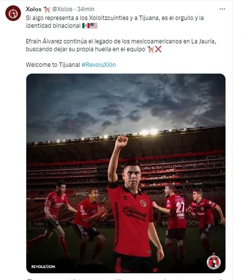 “El Club Tijuana hace oficial el fichaje del mediocampista mexico-americano Efraín Álvarez como nuevo refuerzo para el Apertura 2023, quien llega procedente del LA Galaxy de la MLS”, escribió el club en su cuenta oficial.