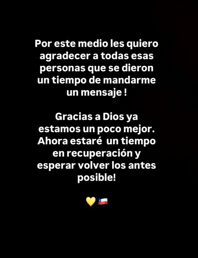 A raíz de estas especulaciones con los posibles pronósticos de su recuperación, el propio futbolista rompió el silencio y publicó un mensaje en sus redes sociales. Afirmando que se encuentra un poco mejor y adelantando que sí estará dado de baja por un tiempo, aunque luchará por regresar lo más pronto posible.