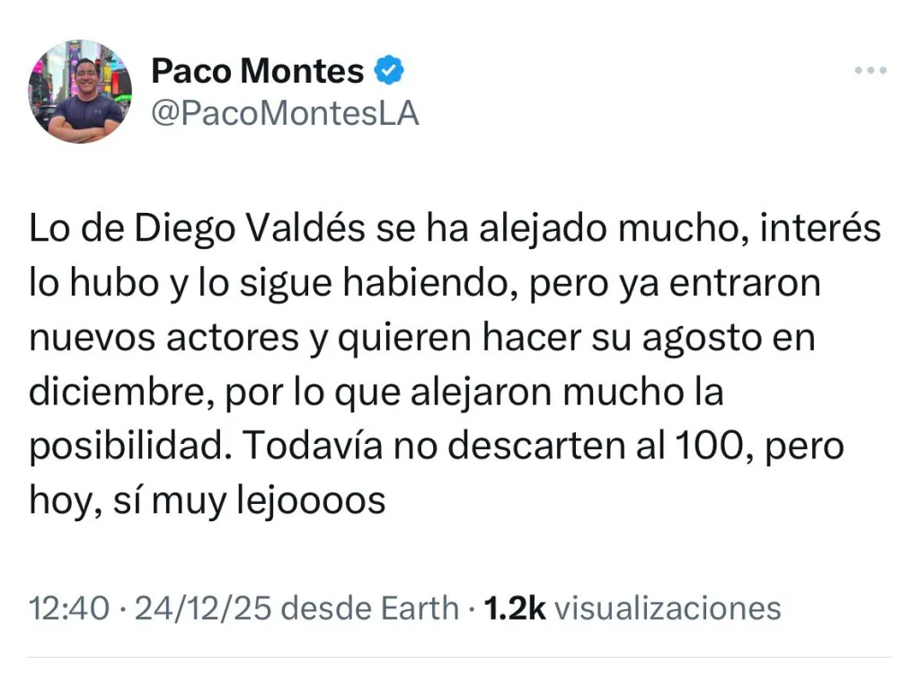 “Lo de Diego Valdés se ha alejado mucho, interés lo hubo y lo sigue habiendo, pero ya entraron nuevos actores y quieren hacer su agosto en diciembre, por lo que alejaron mucho la posibilidad. Todavía no descarten al 100, pero hoy sí, muy lejos”