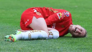 Faustine Robert se convirtió en la primera víctima de esta situación. Pues en una jugada en la que las Escarlatas atacaban, su pie izquierdo quedó atorado en el campo mientras intentaba mandar un centro.