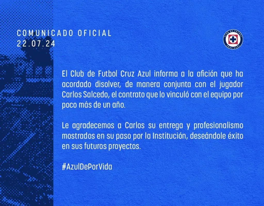 Y, una vez consumado esto, desde el club lanzaron un comunicado bastante breve y sin demasiada información sobre la partida del Titán. “El Club de Futbol Cruz Azul informa a la afición que ha acordado disolver, de manera conjunta con el jugador Carlos Salcedo, el contrato que lo vinculó con el equipo por poco más de un año”, comenzó el mensaje.