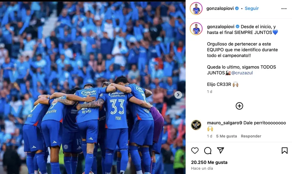 “Desde el inicio, y hasta el final siempre juntos. Orgulloso de pertenecer a este equipo que me identificó durante todo el campeonato. Queda lo último, sigamos todos juntos, Cruz Azul. Elijo CR33R”