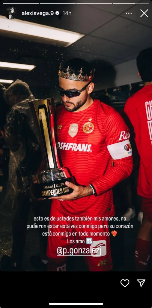 En sus historias de Instagram, el delantero del Toluca compartió varias imágenes y videos de la celebración por el título. Pero resaltó una fotografía en la que aparece todavía con el uniforme de los Diablos Rojos y cargando el trofeo de la Campeones Cup.