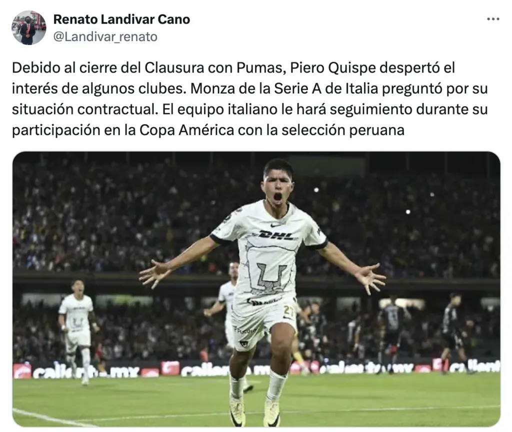 “Debido al cierre del Clausura con Pumas, Piero Quispe despertó el interés de algunos clubes. Monza de la Serie A de Italia preguntó por su situación contractual. El equipo italiano le hará seguimiento durante su participación en la Copa América con la selección peruana”