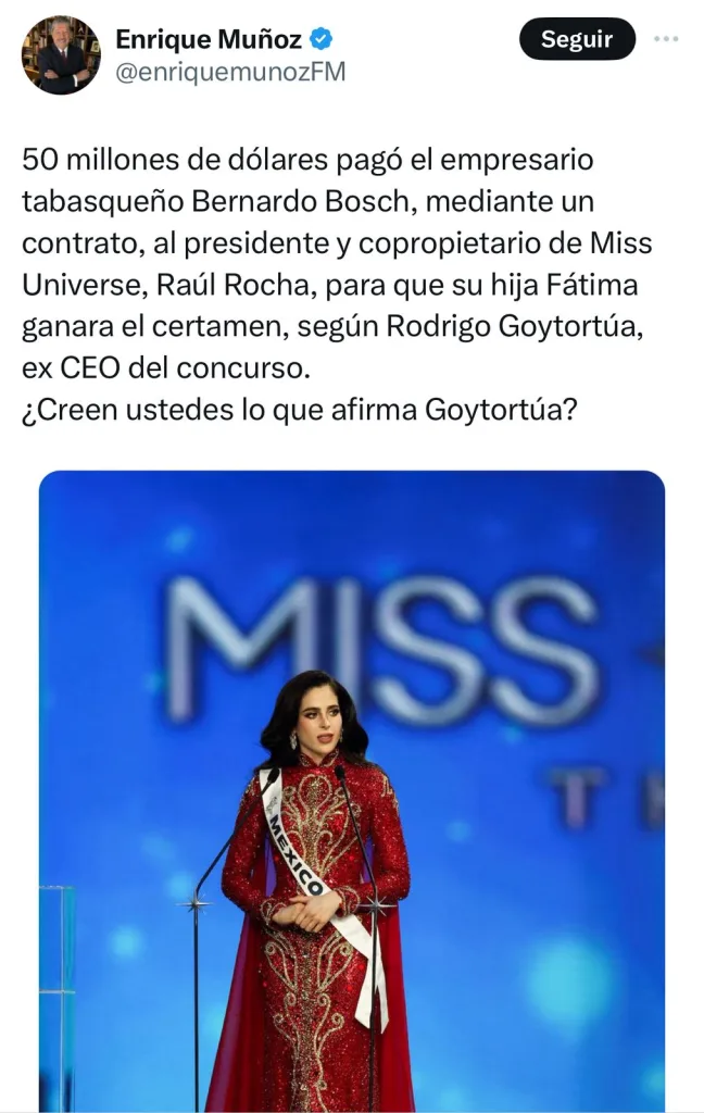 Lo anterior, según dijo en redes, fue porque Raúl Rocha, dueño de Miss Universo, tenía negocios con el padre de Fátima Bosch. Incluso, puntualizó que durante algunas reuniones se le insinuó que votara por la mexicana.
