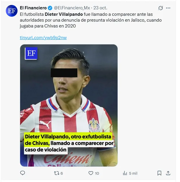 Según lo revelado, la joven en cuestión denunció a Dieter Villalpando ante la Fiscalía de Jalisco de presuntamente haber abusado sexualmente de ella en dicha fiesta. De acuerdo con la denunciante, el ahora futbolista de Juárez ella trabajaba en un restaurante de Zapopan que frecuentaba el futbolista.