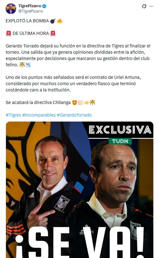 Ahora, circula por redes sociales, por medio de cuentas allegadas al club, que Torrado dejaría la dirección deportiva de Tigres al finalizar el campeonato en curso, lo que daría un giro total al rumbo del equipo.