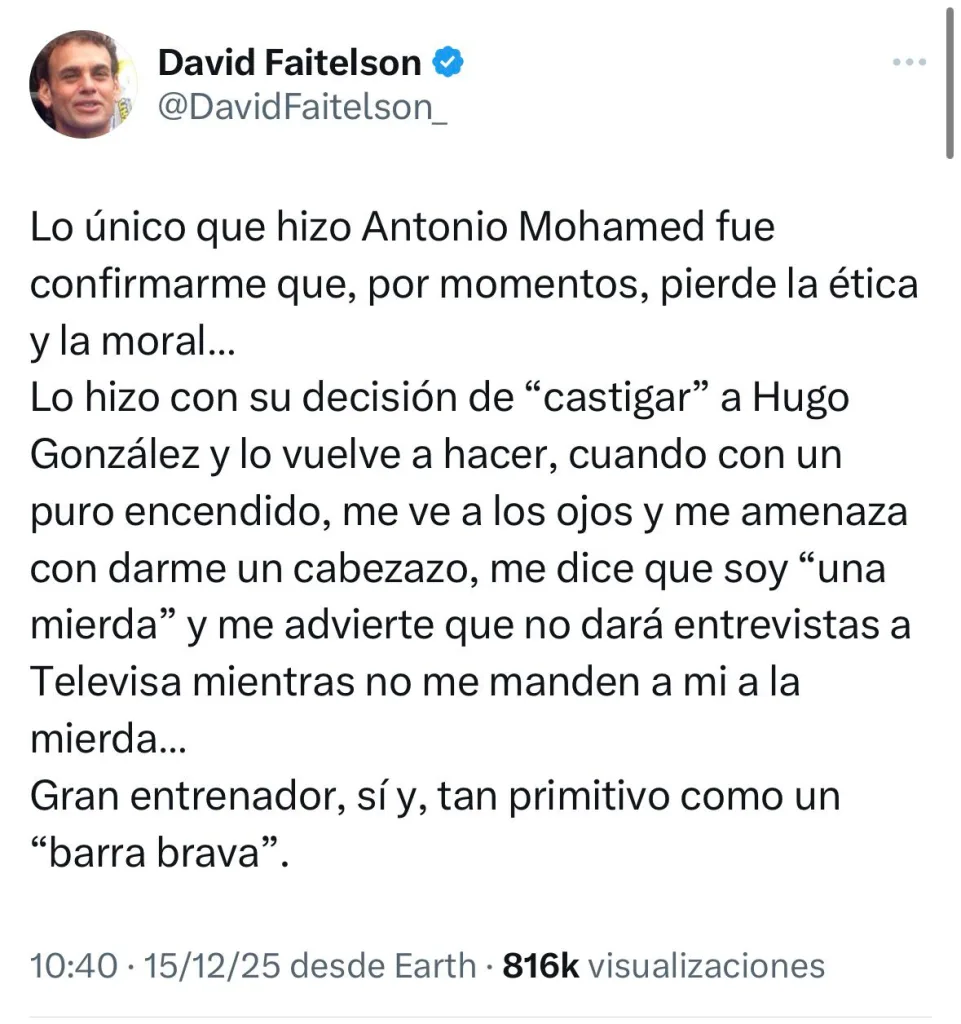 En su cuenta de X, David Faitelson arremetió contra el Turco Mohamed y lo calificó de “majadero, maleducado y altanero”. Además, acusó al argentino de haberlo amenazado con agredirlo.