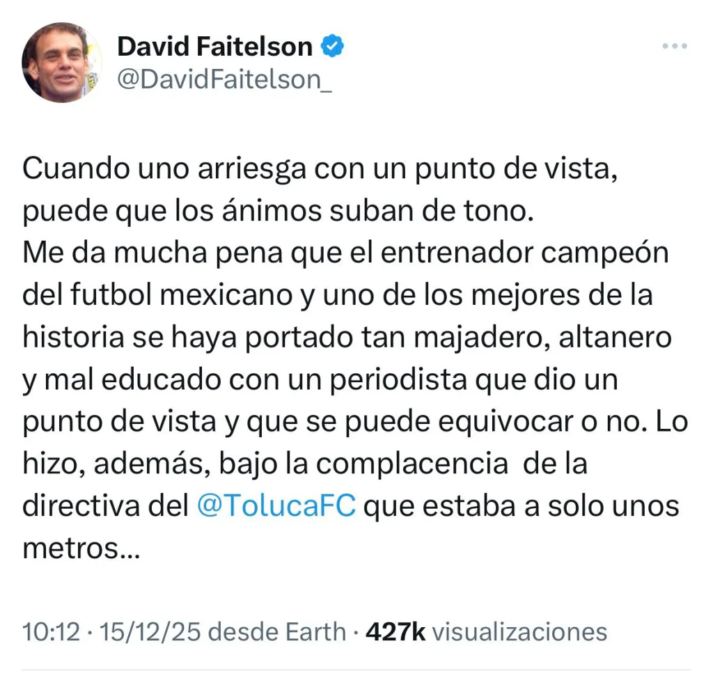 El DT señaló que Faitelson era un “desubicado” que habló de su ética y su moral por hacer un cambio de arquero previo a la transmisión. Y tras decir eso, visiblemente molesto, entregó el micrófono y se fue.