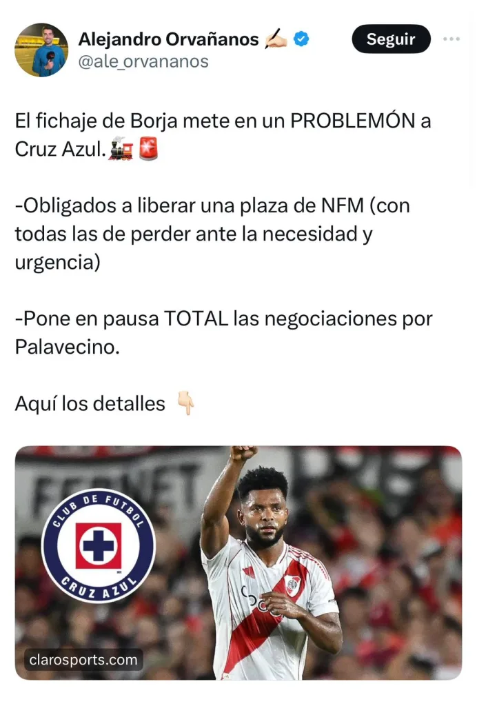 Pero el efecto dominó no termina ahí, pues si Cruz Azul quiere a Agustín Palavecino tendrá que hacer un espacio más en sus plazas de extranjero. Pues el argentino también ocupará un lugar de NFM.