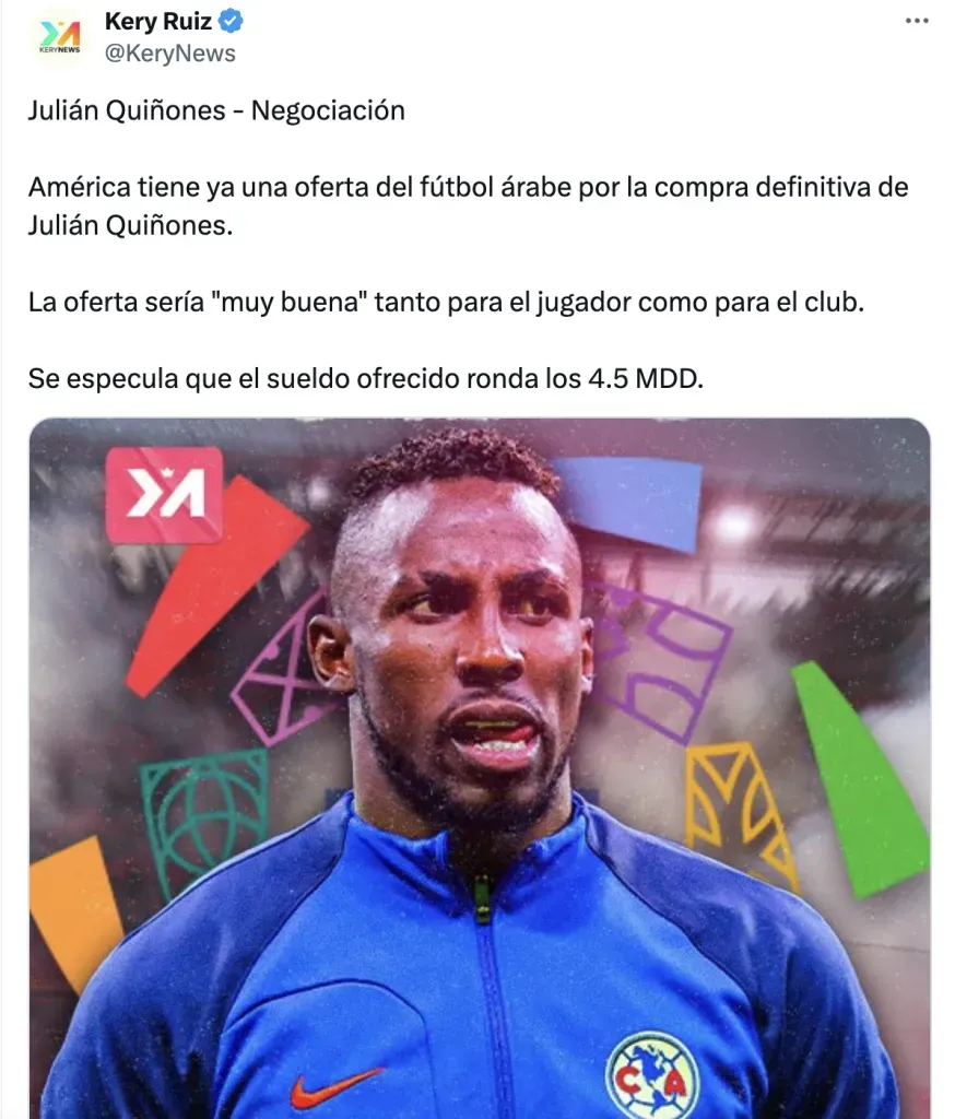 Desde la semana anterior se reportó que Julián Quiñones podría salir del América al término del actual certamen futbolístico, ya que habría una importante oferta desde Arabia Saudita por él, la cual sería tentadora para ambas partes.