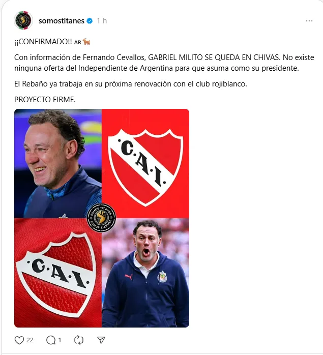 A pesar de que las Chivas de Guadalajara consiguieron el valioso triunfo ante las Águilas del América durante el Clausura 2026. Comenzaron a surgir múltiples rumores sobre una posible salida del entrenador argentino, Gabriel Milito, tras una supuesta oferta del Independiente de Avellaneda.
