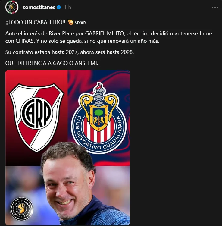 Ante este panorama, se reveló que Gabriel Milito tiene decidido continuar en el conjunto tapatío. Incluso se conoció que en sus planes, junto a la directiva, están en renovar su vínculo por una temporada más, para extender su buen trabajo en el Rebaño.