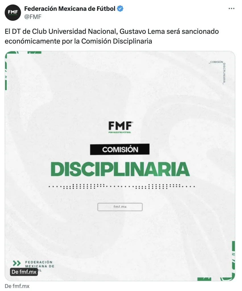 “La Comisión Disciplinaria informa que, determinó sancionar económicamente al director técnico del Club Universidad Nacional, Gustavo Alberto Lema, debido a que durante la conferencia de prensa tras el partido entre su club y el Cruz Azul, de los cuartos de final de Vuelta del Torneo Clausura 2024 de Liga MX, realizó críticas al arbitraje, transgrediendo el Reglamento de Sanciones de la Federación Mexicana de Fútbol”