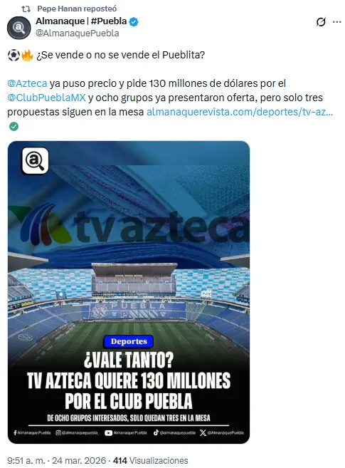 Puebla atraviesa un momento clave en su historia afuera de las canchas, ya que el club podría cambiar de dueños en los próximos meses. El Grupo Salinas, que también es dueño de TV Azteca, trabaja arduamente en las negociaciones, teniendo un total de 8 ofertas sobre la mesa según informa el periodista Pepe Hanan.