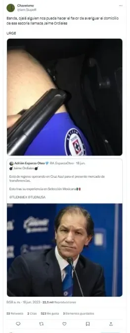Pues dicho usuario usó las redes sociales para publicar una foto en la que se ve un short de Cruz Azul y encima un arma de alto calibre. Junto a la descripción: “Banda, ojalá alguien nos pueda hacer el favor de averiguar el domicilio de esa escoria llamada Jaime Ordiales URGE”.