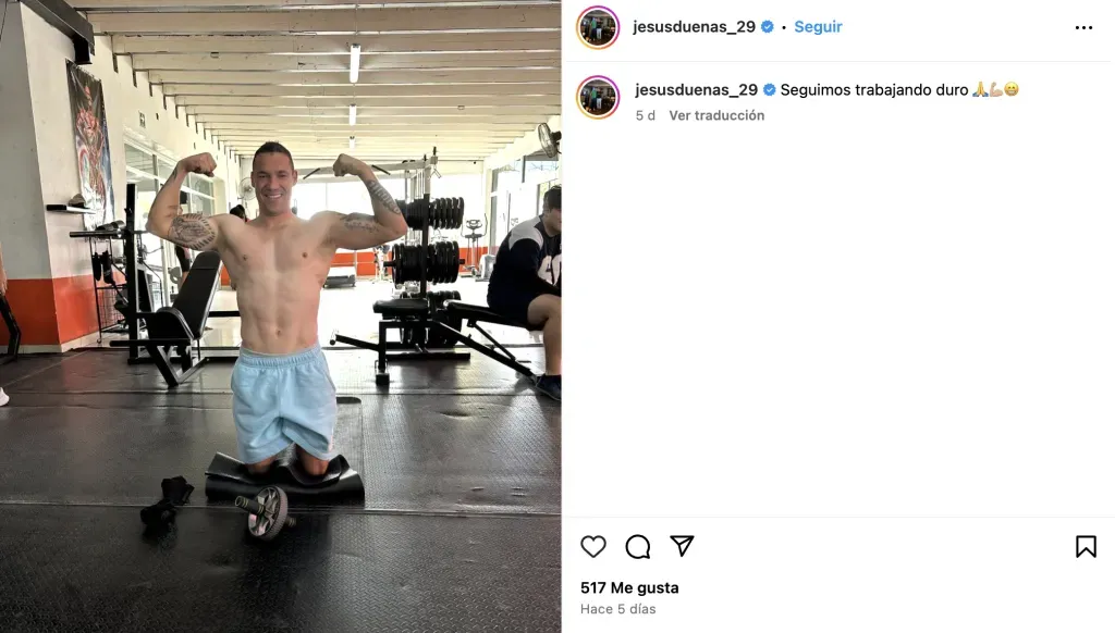 “Seguimos trabajando duro“, fue el mensaje de Jesús Dueñas en sus redes sociales, en donde posteriormente publicó un video de parte de la rutina que realiza para mantenerse en forma.