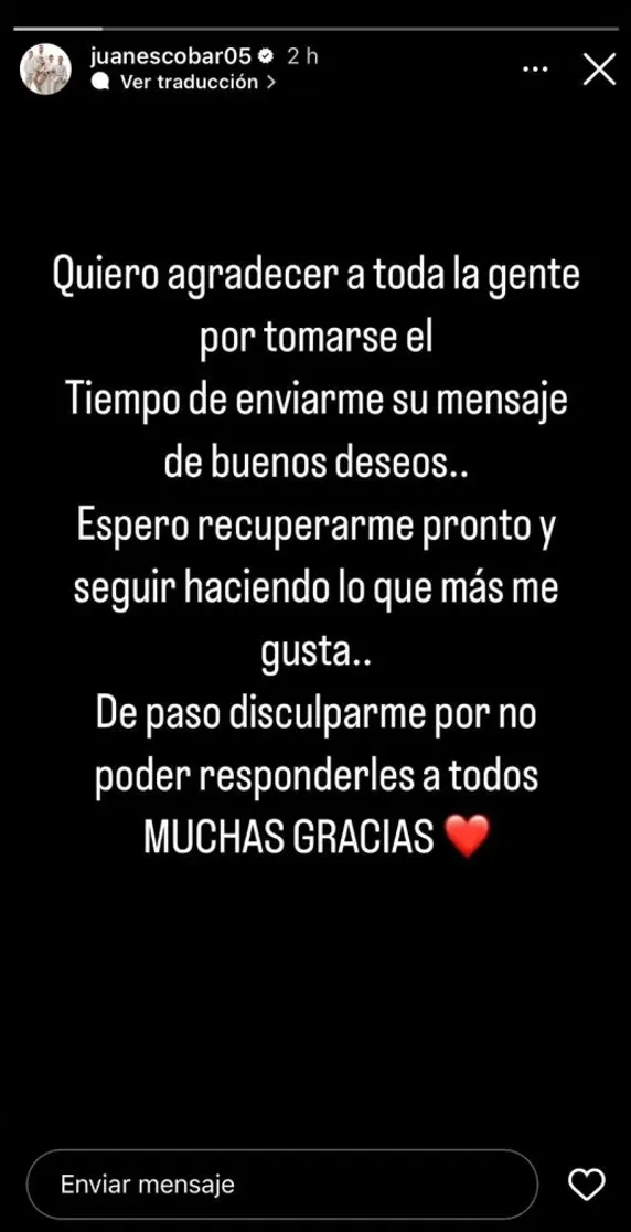 “Quiero agradecer a toda la gente por tomarse el tiempo de enviarme un mensaje de buenos deseos. Espero recuperarme pronto y seguir haciendo lo que más me gusta. De paso disculparme por no responderles a todos, MUCHAS GRACIAS”