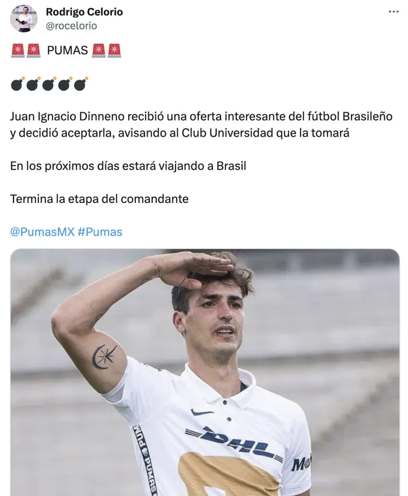 Una noticia que pocos aficionados auriazules se esperaban, ya que Dinenno siempre que pudo, demostró su compromiso con el equipo; sin embargo, el no tener actividad titular durante el Apertura 2023, lo habría orillado a tomar dicha decisión.